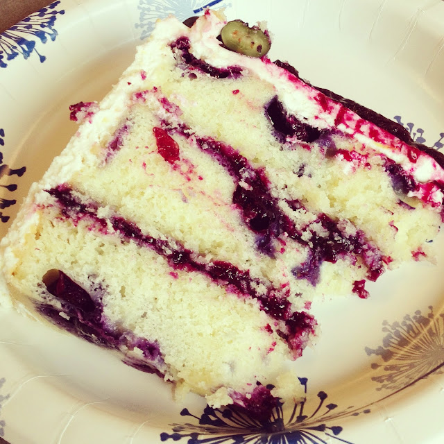 For the cake: I didn't change any of the ingredients in Mother Thyme's cake recipe, except I added about 1 1/2 cups of fresh blueberries (tossed in a little flour) to the batter. I used three 8" cake pans, greased with butter and coated in flour, and baked them at 325 degrees (compared to 350 degrees in her recipe) for a little bit longer time so that they wouldn't rise too much. I learned that tip from this wonderful post on how to build a layer cake from Completely Delicious!